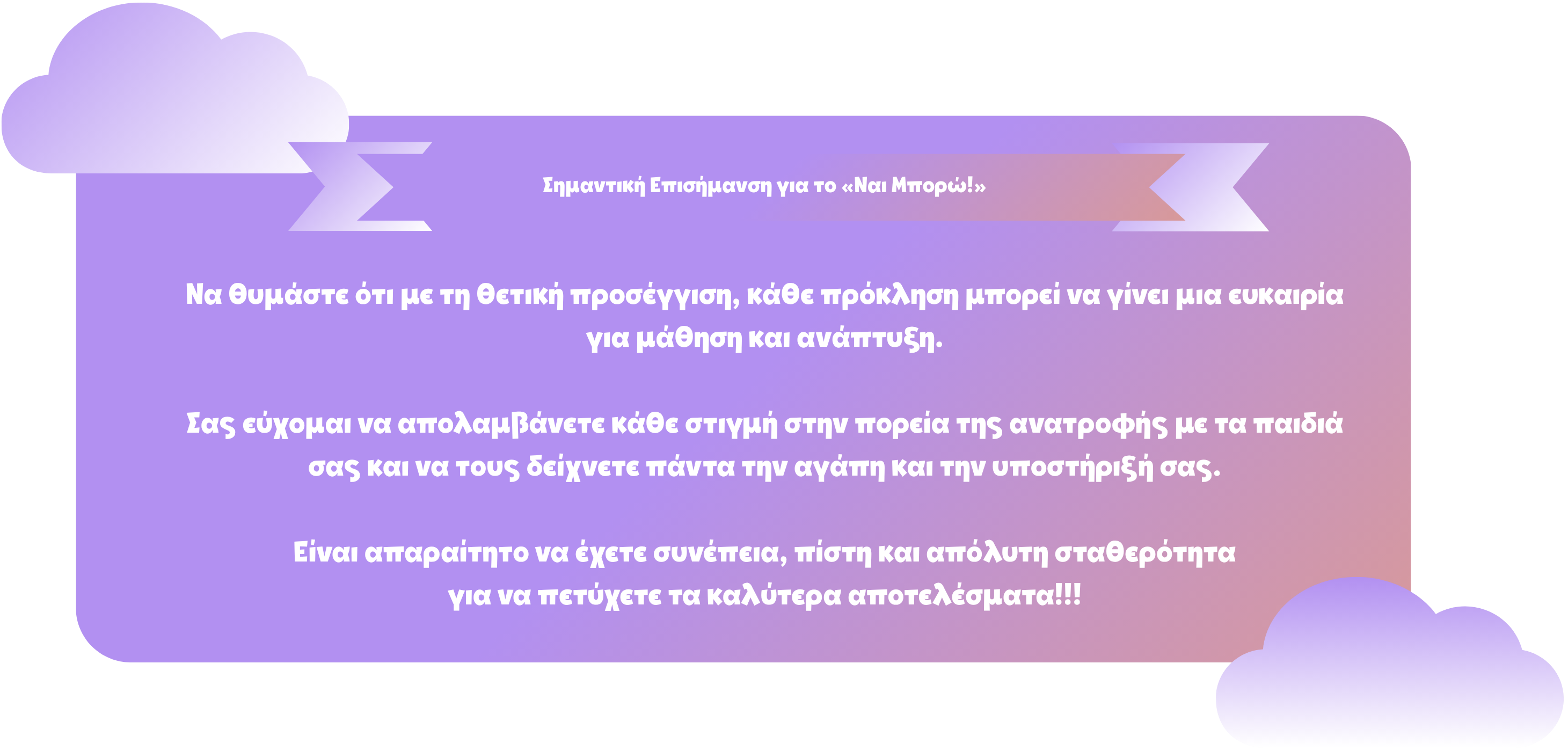 Προτάσεις όπως αυτές περιέχουν τεράστια θετική ενέργεια, δημιουργούν συναισθήματα δύναμης, πίστης, εμπιστοσύνης και ενεργοποιούν το παιδί ώστε να καταβάλει προσπάθεια.