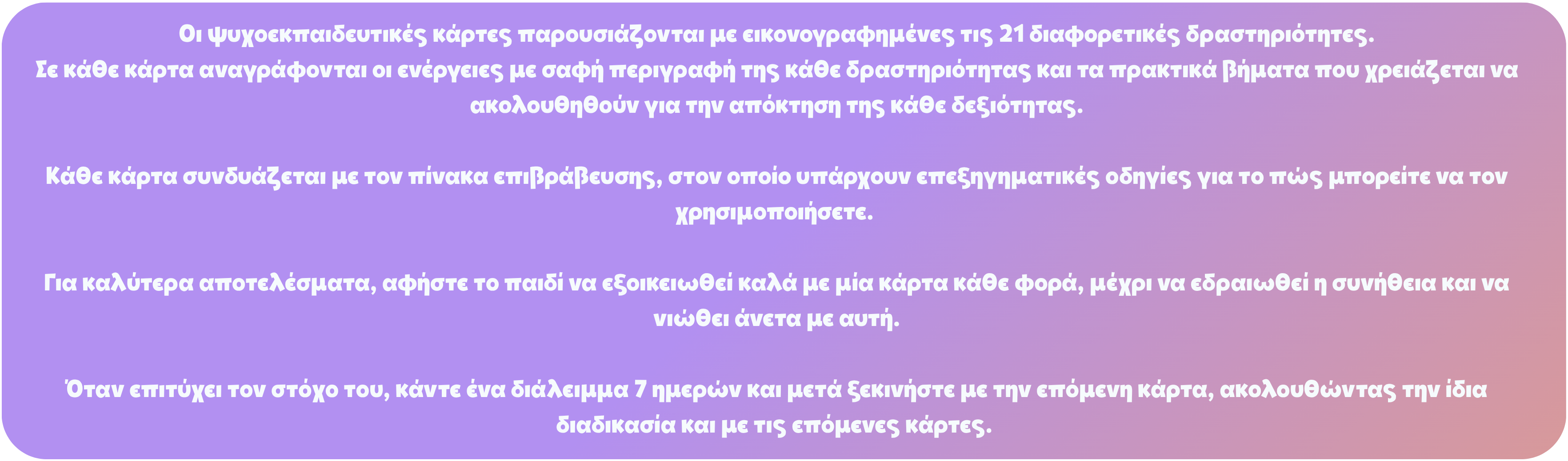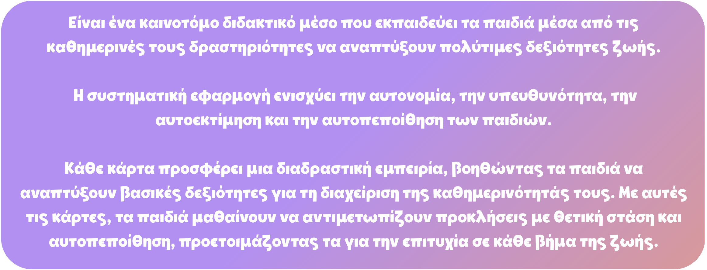 Ο σκοπός της δημιουργίας των ψυχοεκπαιδευτικών καρτών είναι η εκπαίδευση των παιδιών μέσα από τις καθημερινές τους ρουτίνες, ώστε να αναπτύξουν λειτουργικές συνήθειες που θα τα βοηθήσουν να αποκτήσουν σημαντικές δεξιότητες και θετικές αντιλήψεις για τις προσωπικές τους ικανότητες.